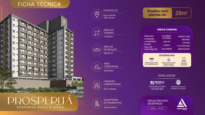 O Prosperitá conta com áreas de lazer completas, incluindo academia, mercado, lavanderia, lounge, sauna, horta e solarium.