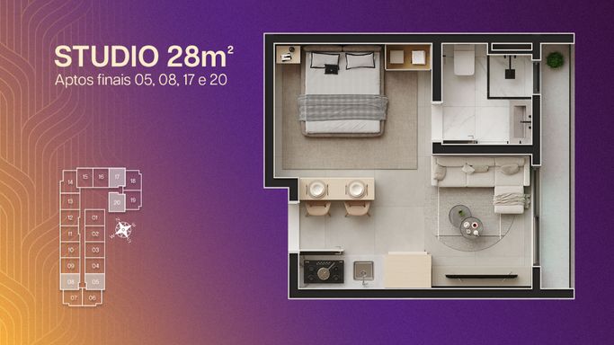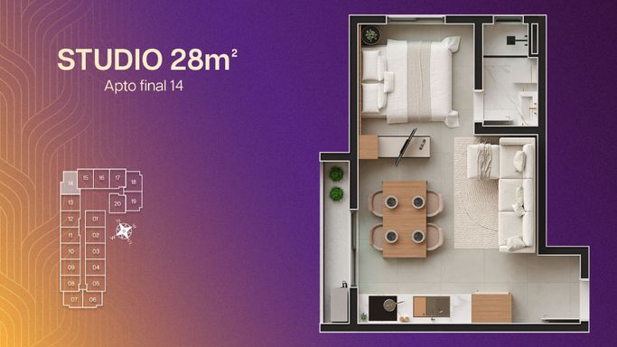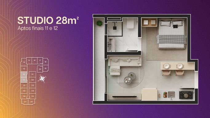 Studios modernos de 28m² com conforto e praticidade no Centro da cidade.